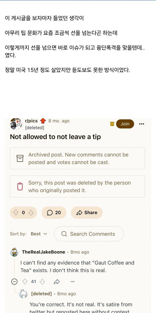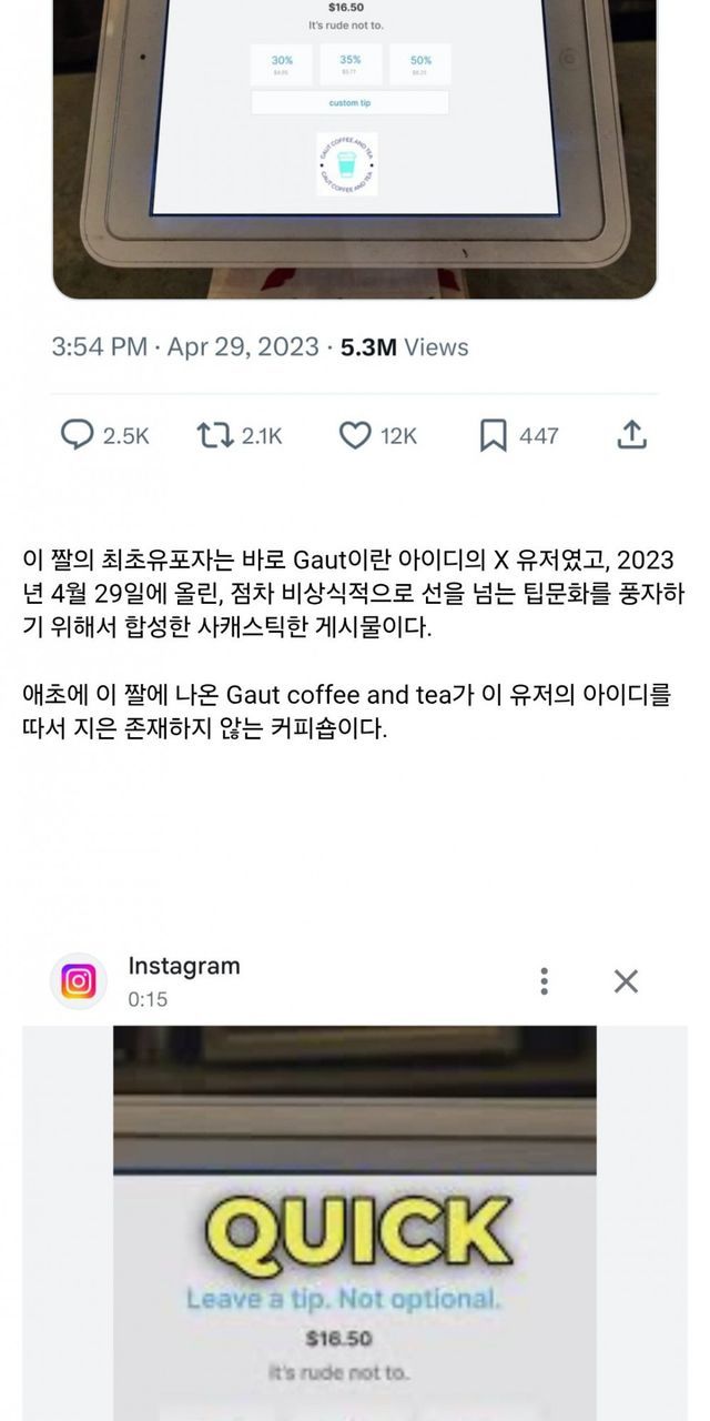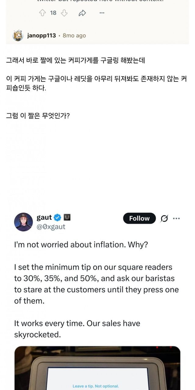 미국의 팁 문화 근황이라고 올라온 짤의 진실