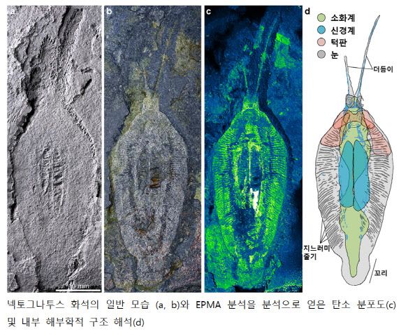 연구팀은 넥토카리디드 화석을 분석한 결과, 몸통에서 2개의 신경절을 발견했다. 신경절이 머리가 아닌 몸통 중앙에 있는 것은 모든 벌레 중 화살벌레에서만 나타나는 특성으로, 넥토카리디드가 화살벌레의 조상이라는 이야기다.
