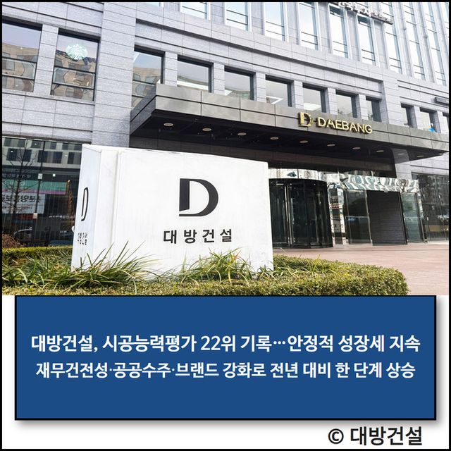 대방건설은 올해 시공능력평가에서 전년 대비 한 계단 상승한 22위를 기록했다고 밝혔다. 국토교통부가 공시한 이번 평가는 △공사실적 △재무구조 △기술 인력 △신인도 등을 종합 반영해 7만여 개 건설사를 대상으로 순위를 산정했다.