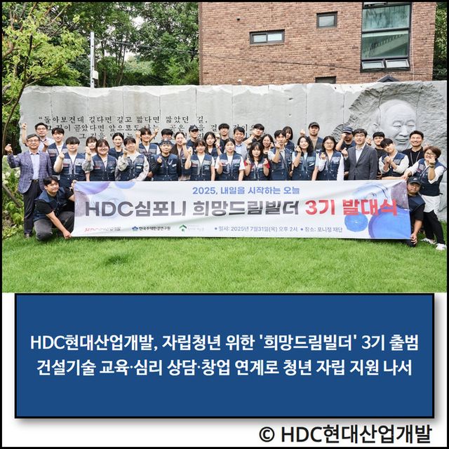 HDC현대산업개발(294870, 이하 HDC현산)은 자립 준비 청년의 사회 진출을 돕는 사회공헌 프로그램 'HDC 심포니 희망드림빌더' 3기를 공식 출범했다. 발대식은 포니정재단빌딩에서 열렸으며, 선발된 30명의 교육생은 경기도 성남시 HDC심포니기술교육장에서 건설 기술 이론과 실습 교육을 받게 된다.