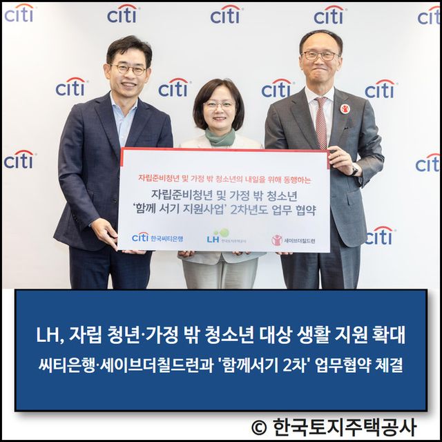 한국토지주택공사(LH)는 자립 준비 청년과 가정 밖 청소년을 대상으로 한 생활 지원을 강화한다고 1일 밝혔다. 이를 위해 지난 31일, 한국씨티은행·세이브더칠드런과 함께 '함께서기 지원사업' 2차년도 업무협약을 체결했다.