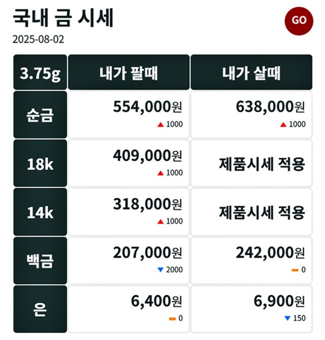 순금(24K) : 매입가 63만 8000원 / 매도가 55만 4000원