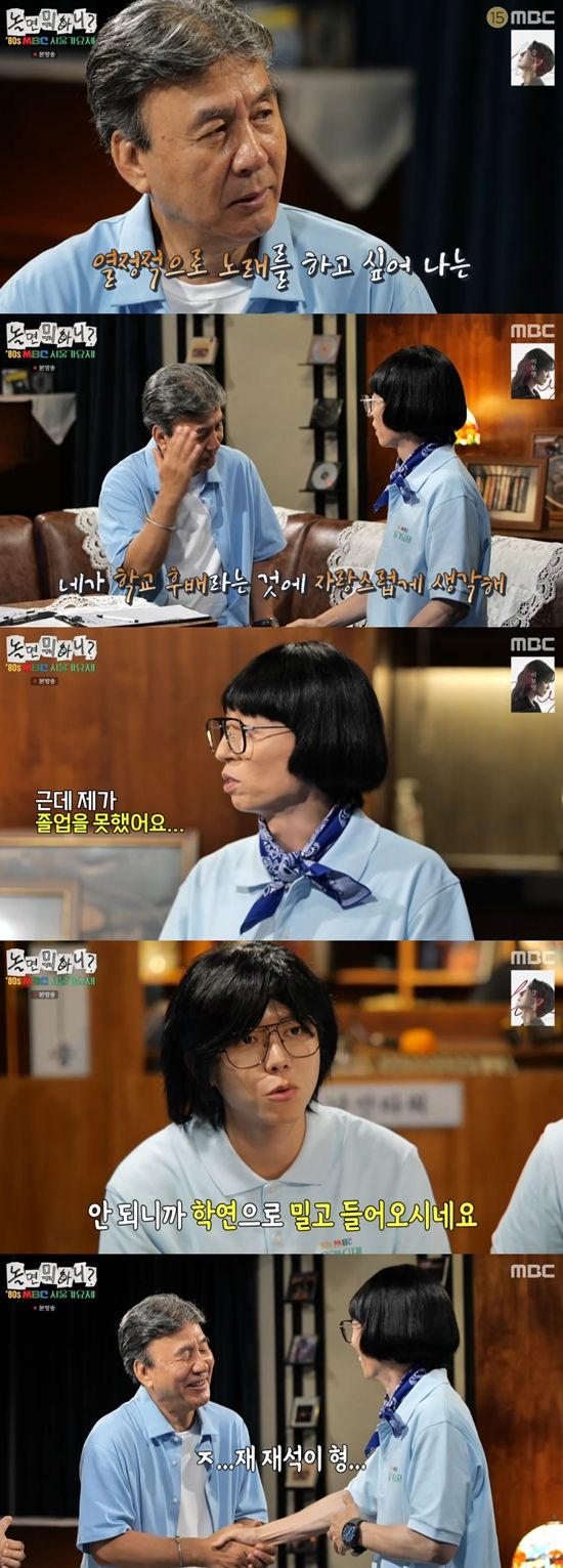 또 유재석에게 "너를 존경한다. 네가 내 후배라는 게 자랑스럽다"라며 칭찬을 건넸다. 유재석이 "저는 학교 졸업을 못 했다"라며 머쓱해하자, 박영규는 ""졸업 못 했다는 게 뭐가 문제냐. 입학했다 게 중요하다"라고 말해 웃음을 자아냈다. 이에 주우재는 "안되니까 학연으로 밀고 들어오신다"라며 일침을 가했다.