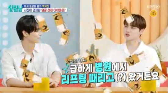 이날 박서진은 더보이즈 주연이 나오자 "어제 아이돌 게스트가 나오신다고 해서 급하게 병원에서 리프팅 때리고 왔다"고 털어놨다.