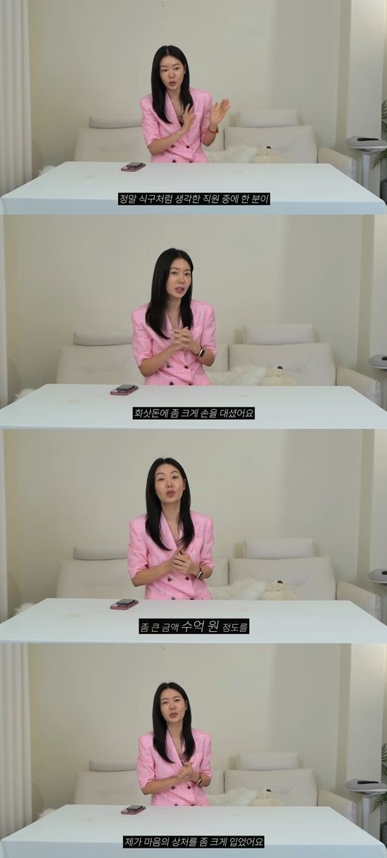 또 "돈도 돈이지만 마음의 상처를 크게 입었다. 왜냐하면 4년을 같이 일했는데 그중에 3년 7개월을 횡령하셨다. 지난 4년의 회계 장부를 뒤집어가면서 내가 얼마나 경영자로서 빵점짜리인지를 스스로 이걸 뒤집어 까본다는 게 굉장히 힘든 행위였다. 배신감도 너무 크고 상처도 너무 크고 회사도 너무 오기 싫고 다른 죄 없는 직원들 얼굴도 잘 못 보겠고 트라우마같이 생겼다"라며 눈물을 보였다.