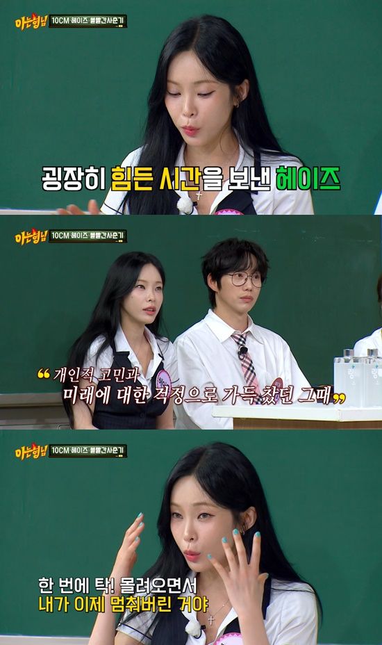 헤이즈는 "나는 너무 힘든 시간을 보냈던 적이 있는데, 그 시간이 되게 길었다. 개인적인 고민과 앞으로에 대한 생각이라던지 이런 게 한 번에 탁 몰려오면서 멈춰버렸다"면서 "감사한 게 싸이 오빠가 나를 꺼내주려고 많이 노력해주셨다"고 고백했다.