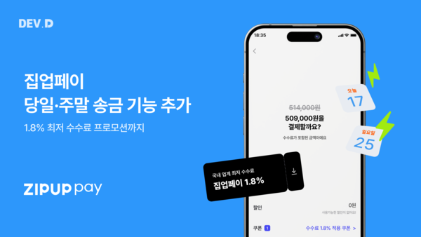 프롭핀테크 스타트업 데브디주식회사(대표 김기태)가 운영하는 월세 카드결제 서비스 '집업페이'가 당일송금과 주말송금 기능을 신규 도입하며 이용자 편의성을 대폭 강화했다. 이번 업데이트로 임차인들은 월세 납부일을 놓치더라도 평일 오후 3시, 주말 오전 11시까지 신청 시 당일 결제가 가능해졌다.