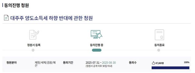 3일 오전 10시 55분 기준 국회 국민동의 청원 게시판에 올라온 ‘대주주 양도소득세 하향 반대 청원’은 8만 7800명의 동의를 받았다. 해당 청원은 지난달 31일에 게재돼 하루 만에 5만명 이상의 동의를 받았다. 5만명 기준을 넘기면 국회 소관위원회 및 관련 위원회로 넘어간다.