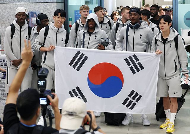 잉글랜드 프리미어리그(EPL) 토트넘 홋스퍼의 손흥민과 양민혁이 지난 1일 오후 프리 시즌 투어를 위해 인천국제공항 제1터미널에 도착해 태극기를 펼쳐 들고 포즈를 취하고 있다. 토트넘은 3일 오후 8시 서울월드컵경기장에서 뉴캐슬 유나이티드(잉글랜드)와 경기를 치른다 / 뉴스1
