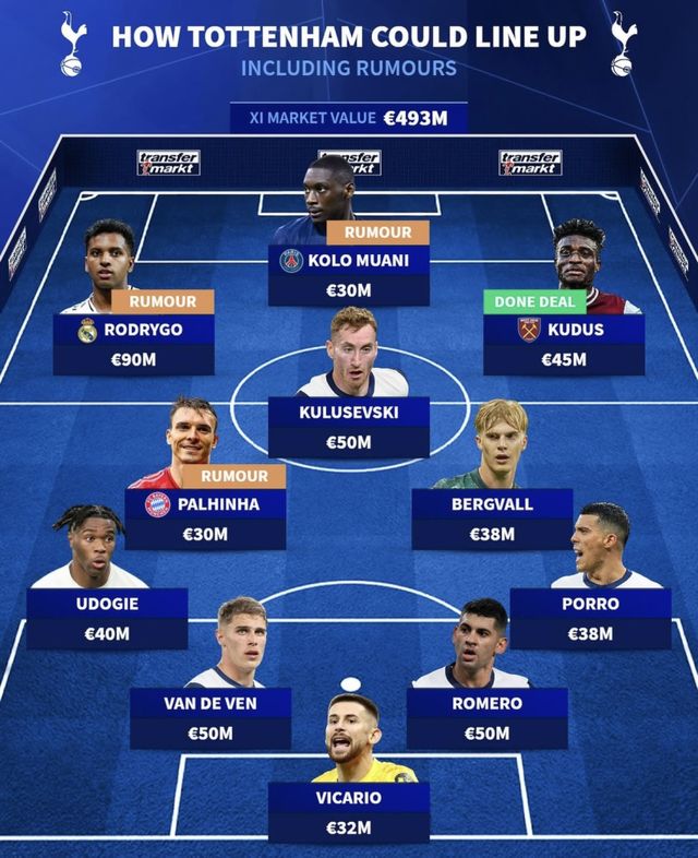트랜스퍼마르크트는 스트라이커 랑달 콜로 무아니(파리 생제르맹), 중앙 미드필더 주앙 팔리냐(바이에른 뮌헨) 등이 토트넘 스쿼드에 추가될 수 있다고 내다봤다.