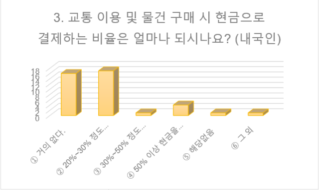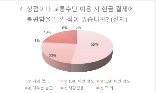 '상점이나 교통수단 이용 시 현금 결제에 불편함을 느낀 적이 있느냐'는 질문엔 '거의 없다'가 52%로 과반을 차지했다. '10회 미만'은 23%, '대부분 불편'은 16%로 불편감을 호소하는 비율이 40%에 가까웠다. 이로써 내·외국인 모두 현금 결제에 불편함을 거의 느낀 적이 없었다는 비율 못지않게 불편함을 느낀 사람들의 비율도 상당하다는 걸 알 수 있었다.