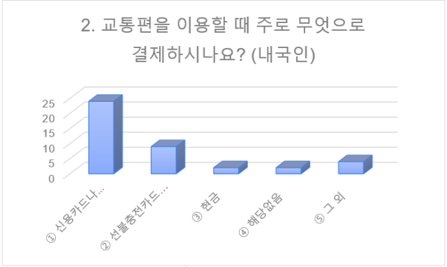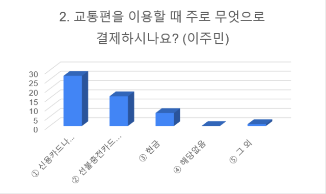 '교통편을 이용할 때 주로 무엇으로 결제하느냐'는 질문엔 내국인과 외국인 모두 상당수가 금융권 카드나 선불카드로 이용했다. 다만, 현금을 이용하는 경우는 내국인 2명에 비해 외국인은 7명으로 차이가 있었다. 이주민 응답자 대부분이 수도권에 거주하고 있어 현금을 사용하면 환승 할인을 받지 못하는 불리함이 있기에 현금 사용자가 많지 않을 줄 알았는데, 40명 중의 7명(17.5%)으로 예상보다 많은 이들이 현금을 사용하고 있었다.
