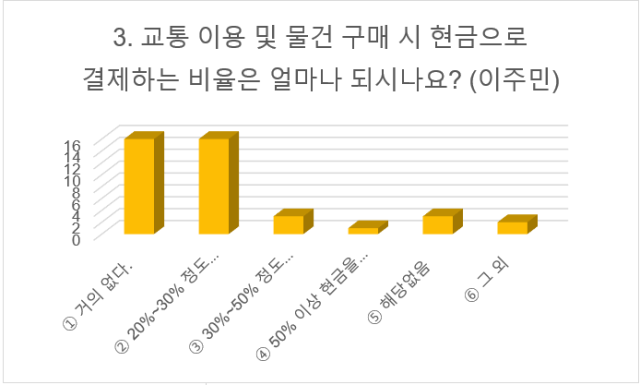 '교통 이용 및 물건 구매 시 현금으로 결제하는 비율은 얼마나 되느냐'는 질문에는 '20% 이상 현금 결제를 한다'고 응답한 사람은 전체 79명 중 42명(약 53%)으로 과반이 넘었다. 꽤 많은 이들이 여전히 현금을 사용하고 있다는 걸 알 수 있었다. '50% 이상' 이라고 답한 응답자는 이주민 중에선 1명인 데 반해, 내국인은 4명으로 더 많았다. 4명 모두 65세 이상 나이에 해당하는 응답자다.