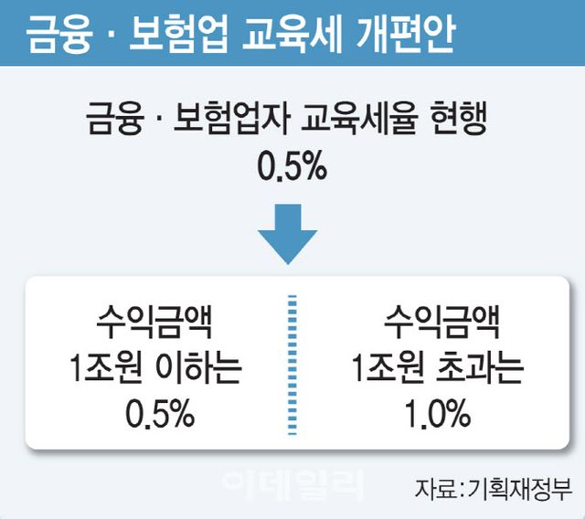 3일 정부와 금융권에 따르면 기획재정부는 ‘2025년 세제개편안’에 금융·보험업자 교육세 부담을 최고 1.0%까지 높이기로 했다. 현재 금융·보험업자에는 일괄적으로 0.5%의 교육세율을 적용하는데 개정안은 수익금액이 1조원을 초과하는 금융·보험업자에 교육세율 1.0%를 적용키로 했다. 이에 따라 약 60개 대형 은행·보험사들은 지금 내던 교육세의 두 배를 내야 한다.
