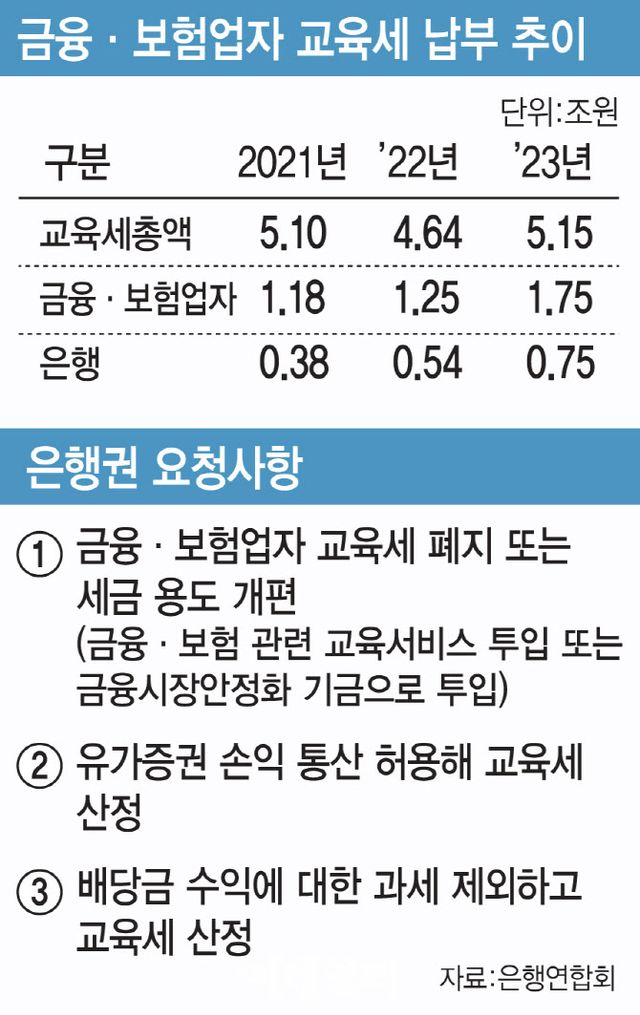 실제 그동안 금융·보험업자의 교육세는 매년 증가해 전체 교육세의 34%를 책임지고 있다. 2023년 기준 총 5조 1500억원의 교육세 중 금융·보험사가 낸 교육세는 1조 7500억원으로 전체의 34%를 차지했다. 특히 은행이 내는 교육세는 2021년 3800억원, 2022년 5400억원, 2023년 7500억원으로 2년 새 두 배 수준으로 불어났다.