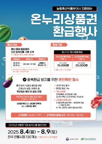 홍인기 유통소비정책관은 “전통시장 온누리상품권 환급행사는 매년 추석과 설 명절에만 실시해 왔으나 이번에는 여름철 특별 할인행사에 포함하여 실시한다.”라고 하면서, “소비쿠폰과 함께 이번 전통시장 환급행사를 통해 전통시장을 찾는 소비자들의 국산 농축산물 구매 부담이 확실하게 덜어지기를 기대한다.”라고 밝혔다.