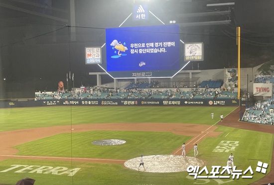 경기 중반부터 그라운드에 떨어지기 시작한 빗줄기가 7회에 접어들며 급격히 굵어졌다. 8회 시작을 앞둔 오후 8시51분경 경기가 우천 중단됐고, 마운드와 홈 베이스 주변에 방수포가 깔렸다.