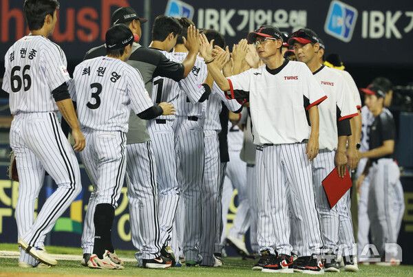 7회말 삼성 공격 종료 후 비가 쏟아지면서 경기가 끝났고, LG는 승리의 기쁨을 누렸다.