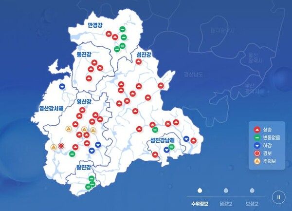 영산강홍수통제소는 "비가 더 내릴 것으로 보여 홍수주의보를 발령했다. 피해에 대비하길 바란다"고 당부했다.