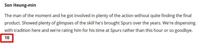 손흥민의 평점을 10점으로 매긴 이유에 대해 그는 "손흥민은 최종 결과물을 찾지 못했지만 많은 행동을 보여줬다"라며 "그가 수년 동안 토트넘을 이끌어 온 기술을 많이 엿볼 수 있었다"라고 설명했다.