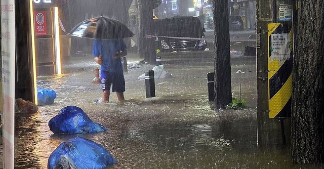 무안군을 중심으로 광주·전남 곳곳에 극한호우가 쏟아진 지난 3일 오후 광주 북구 운암동 도심에서 한 시민이 침수된 거리를 이동하고 있다 / 연합뉴스