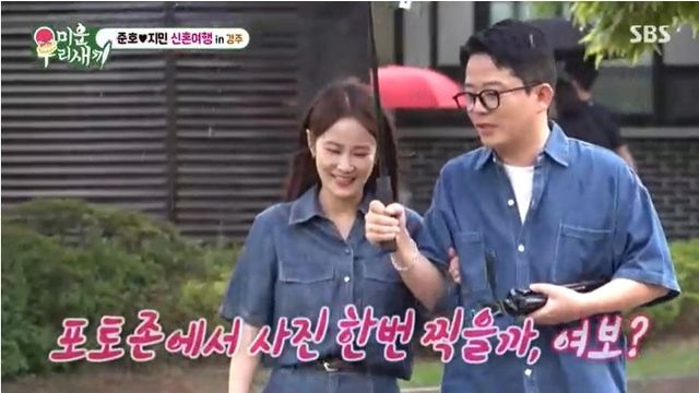 경주로 신혼여행을 온 두 사람은 청청 커플룩을 맞춰 입고 우산 아래 딱 붙어 다정하게 등장했다. 대릉원 내 포토존으로 향한 이들은 다른 커플이 사진을 찍는 걸 보고 깜짝 놀랐다. 남성이 여성을 번쩍 들어 올리는 포즈 때문. 첫 번째 시도에서 김준호는 김지민을 제대로 안아 올리지 못해 웃음을 자아냈다. 두 번째 기회 역시 나쁜 손(?)으로 실패한 부부는 마지막 세 번째 시도에서 비로소 예쁜 커플 사진을 건졌다.
