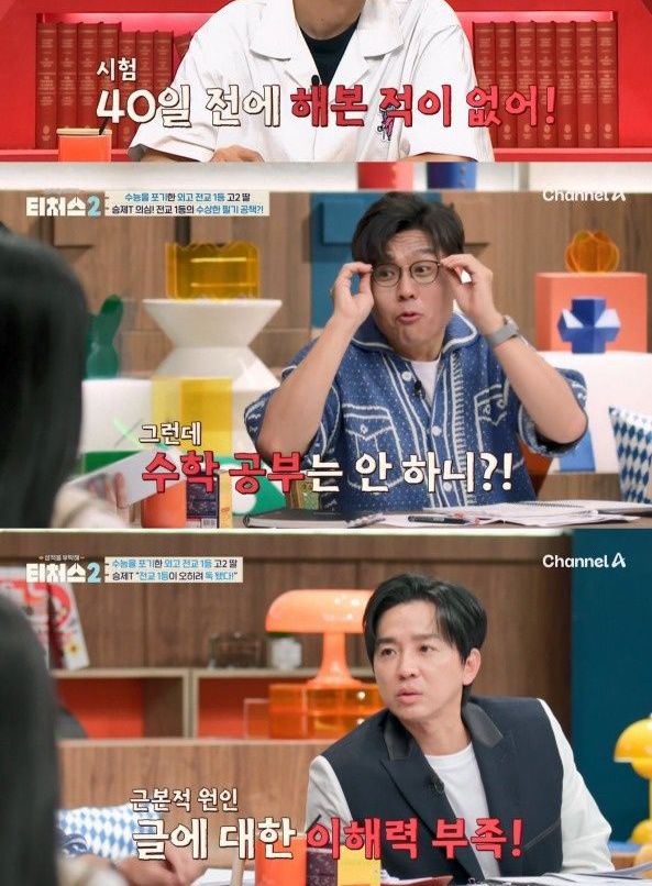 정승제도 “수학도 문제와 해설을 통으로 외워서 풀었다. 학교 시험 문제가 모의고사보다 어려운데, 고난도 문제를 암기해서 푼 거다. 급급한 마음에 이해가 아니라 암기를 선택했다”며 도전학생의 잘못된 암기식 공부를 문제의 원인으로 짚었다.