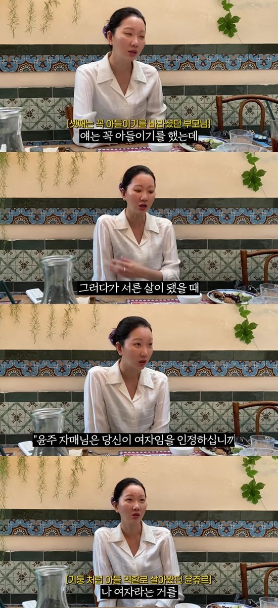 영상에서 장윤주는 모친이 아들 노릇을 하기를 바랬다며 "둘째도 아들이길 원했는데 딸이었고 나도 꼭 아들이길 했는데 또 딸이었다. 집에서 항상 '쟤가 아들이었어야 했다'(는 말을 들었다.) 엄마가 동네 분들이랑도 '얘가 걔잖아. 아들이었으면 했는데 딸인 그 애'라고 했다. 그 얘기를 너무 많이 들어서 내가 창피해하고 슬프고 속상해했다"고 고백했다.