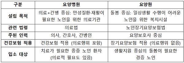쉽게 말하면 요양병원은 치료와 간병이 동시에 필요한 환자에게, 요양원은 치료가 불필요하고 생활 지원만 필요한 노인에게 적합하다. 즉 요양병원은 의료행위가 이뤄지는 곳으로 큰 병원에서 수술 등을 마치고 퇴원한 뒤 추가 치료와 재활이 필요한 노인환자가 선택할 수 있다. 간병인뿐 아니라 의사, 간호사가 상주하며 의료법의 적용을 받는다.