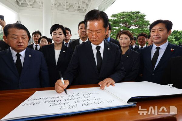 정 대표는 현충탑 참배를 마친 후 방명록에 '더민주적인 민주당, 더 유능한 민주당, 더 강력한 민주당을 만들어 이재명 정부를 뒷받침하겠다'고 적었다. 정 대표는 곧이어 김대중 대통령 묘역을 참배한 이후 국립현충원을 떠났다.