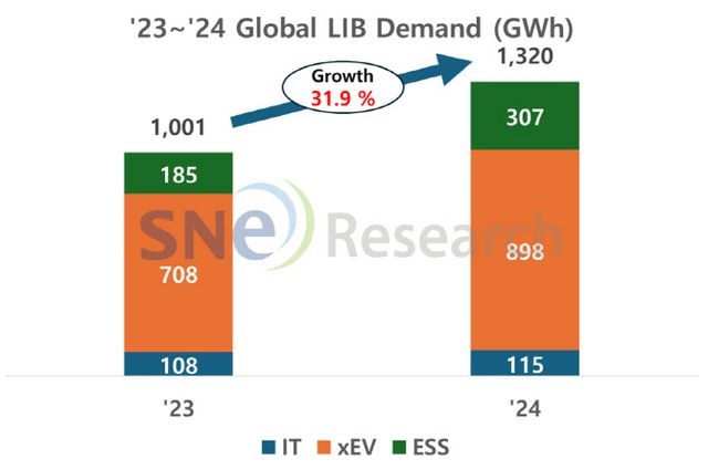 에너지 전문 시장조사업체 SNE리서치에 따르면 지난해 LIB 전체 수요는 1320기가와트시(GWh)로 전년 대비 31.9% 성장했다.