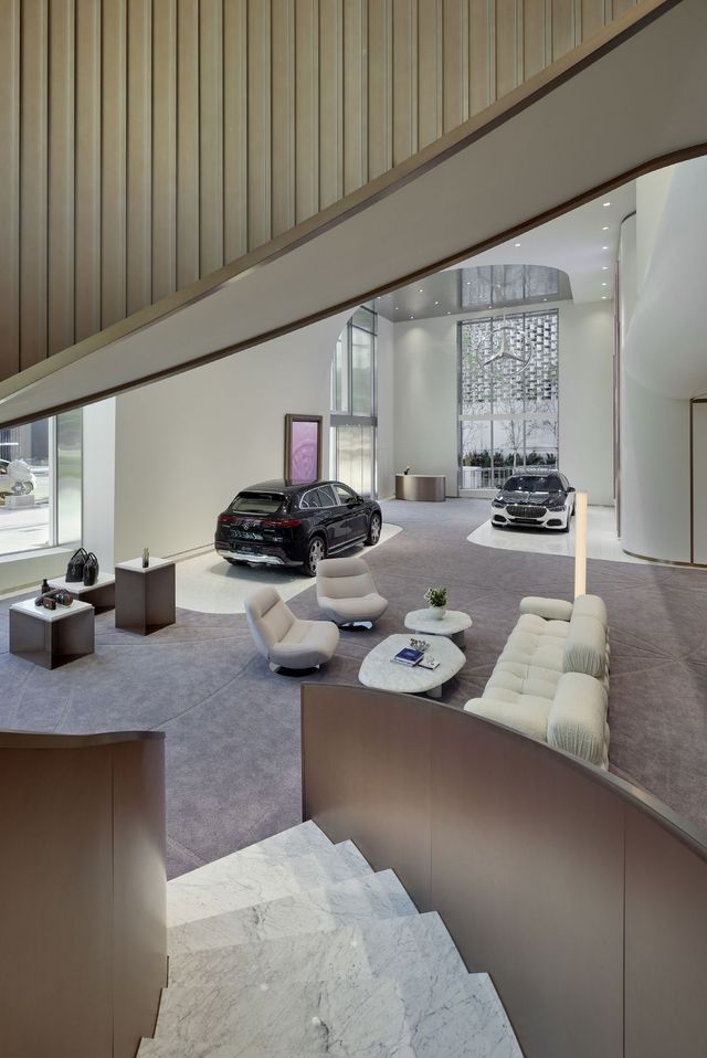 마이바흐 센터가 위치한 압구정 명품거리는 각종 패션 브랜드의 플래그십 스토어로 잘 알려진 곳이지만, 그중에서도 마이바흐 센터의 외관은 눈에 띈다. 한복 고유의 곡선 주름에서 영감을 받은 건물 외관과 버선코처럼 부드럽게 치솟은 건물의 모서리는 ‘한옥의 처마’와 닮았다. 대리석과 유리조각을 섞은 마감재를 이용했다. 실내로 들어서면 독일에서 공수한 우드 패널과 이탈리아 가구 브랜드 ‘B&B Italia’와 ‘리네로제’ 등 감각적인 가구가 방문객을 맞이한다.