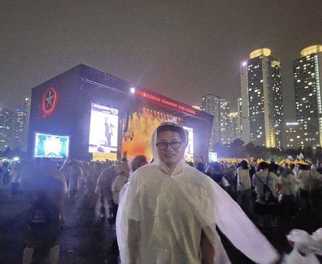 그가 공개한 사진 속에서 그는 하얀 우비를 입은 채 미소를 띄고 있는 등 현장을 즐기는 분위기를 자아냈다.
