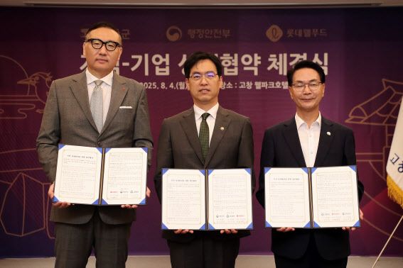 행정안전부는 4일 고창군 웰파크호텔에서 롯데웰푸드 및 고창군과 ‘지역-기업 상생협력 업무협약식’을 개최했다고 밝혔다.