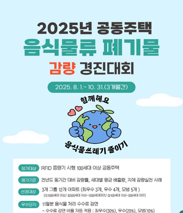 3개월의 음식물쓰레기 감량 활동 실적이 끝나면 각 공동주택은 1500세대 이상 단지, 500~1500세대 단지, 100~500세대 단지로 그룹화하여 총 12개 우수단지를 선정해 인센티브를 부여할 예정이다.