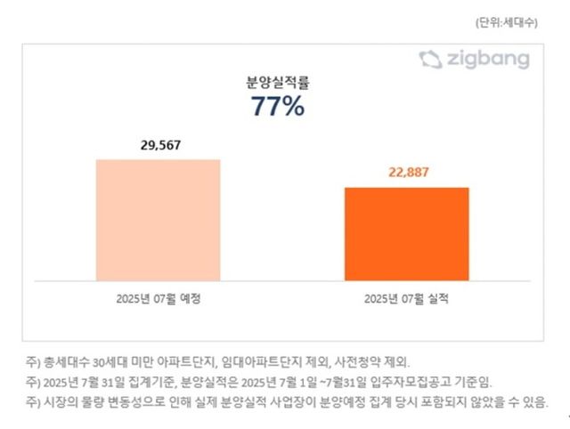 2025년 7월, 분양계획 대비 분양 실적 비교. Ⓒ 직방