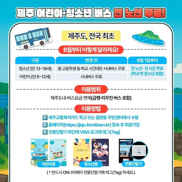 이는 지난 4월 제주특별자치도와 제주도교육청이 체결한 '청소년 대중교통 무료이용 업무협약(MOU)'의 결과로 청소년과 어린이 모두에게 더 쉬운 교육 문화 접근 기회를 위한 조치다.