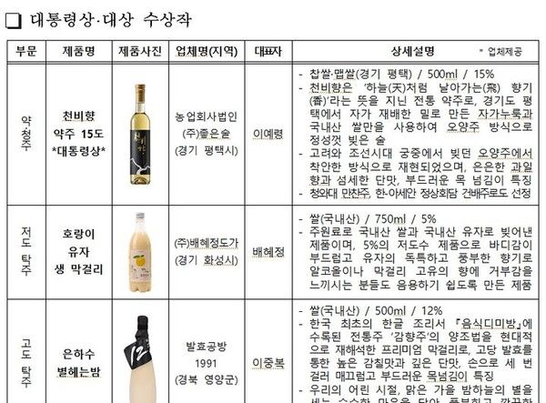 각 수상작에 대한 상세 정보 및 구입처는 전통주 종합 플랫폼 '더술닷컴'(thesool.com)에서 확인할 수 있다.