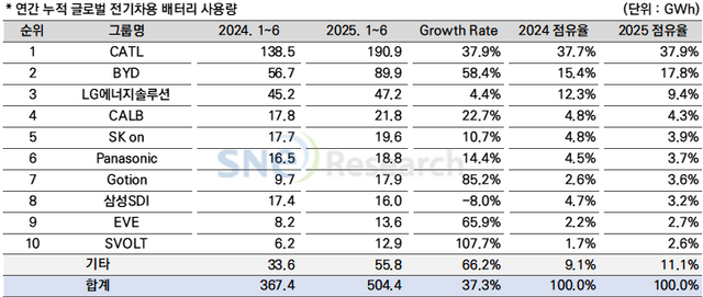 CATL은 전년 동기 대비 37.9%(190.9GWh) 성장하며 글로벌 1위 자리를 견고히 유지했다.