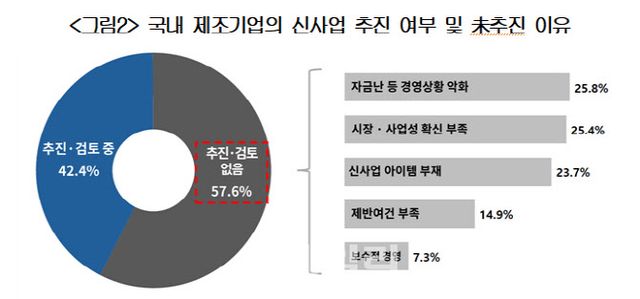 문제는 이런 와중에 신사업 추진은 부진하다는 점이다. 현재 주력제품을 대체할 신사업을 착수했거나 검토 중에 있는지 묻는 질문에 ‘추진하고 있거나 검토 중’이라고 응답한 기업은 42.4%였다. 과반이 넘는 57.6%의 기업은 ‘진행 중인 신사업이 없다’고 했다. 제조기업들은 기존 사업의 한계를 인식하면서도 경영 여건과 시장 상황 등 복합적인 요인으로 인해 신사업 추진을 포기한 것으로 나타났다. 신규 사업을 추진하지 못하는 가장 큰 이유는 ‘자금난 등 경영 상황 악화’(25.8%)와 ‘신사업 시장·사업성 확신 부족’(25.4%) 등으로 나타났다.
