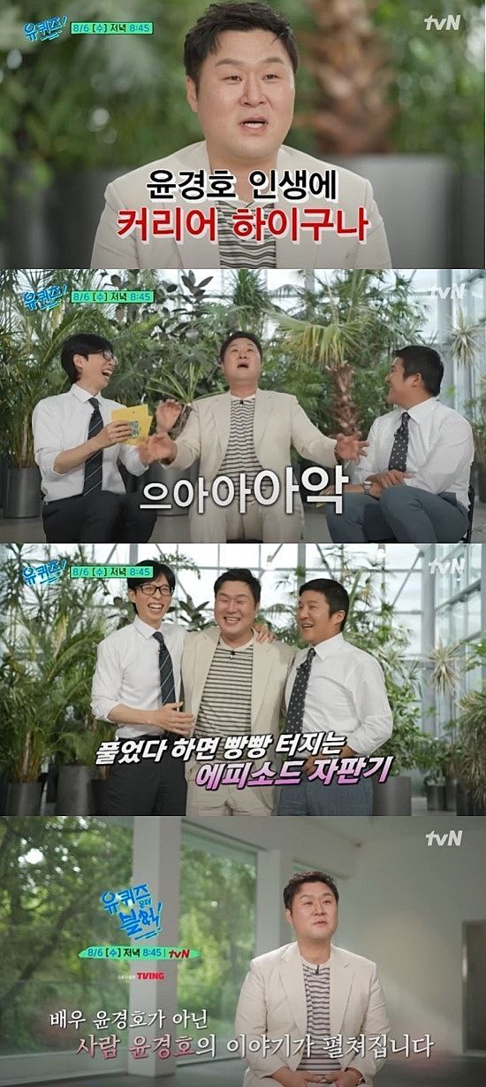 윤경호가 촬영장에 등장하자마자 눈물을 흘려 MC 유재석이 "이런 눈물은 처음"이라며 웃는다.