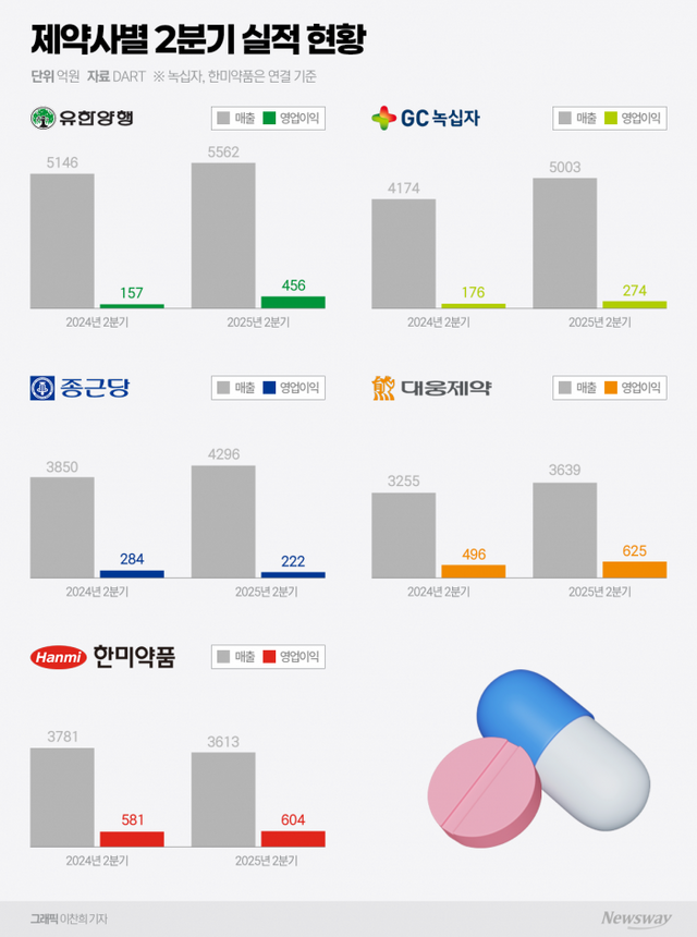 대웅제약은 보툴리눔 톡신 '나보타'를 비롯한 주력 품목의 성장에 힘입어 외형 확대와 수익성 개선을 동시에 이뤘다. 2분기 매출은 3639억원, 영업이익은 625억원으로 전년 동기 대비 각각 11.8%, 26.0% 증가했다.