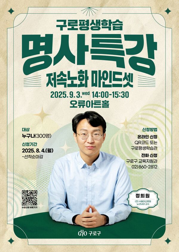 서울 구로구가 다음 달 3일 오후 2시 오류아트홀에서 정희원 박사의 '저속노화 마인드셋'을 주제로 명사 특강을 개최한다고 4일 밝혔다.