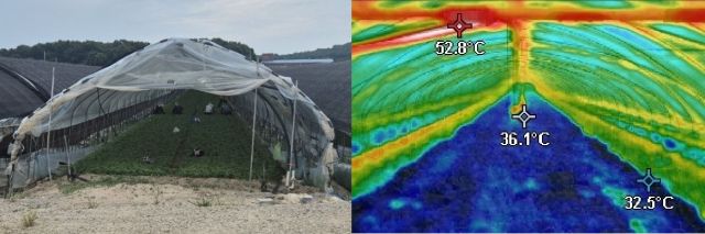 중간 중간 작물이 심어진 비닐하우스 몇 곳을 열화상 카메라로 촬영했다. 작물이 열을 흡수해 상대적으로 덜 뜨거운 바닥의 온도도 32도를 넘었다. 비닐하우스 안에 금속 살이 덧대진 곳의 온도는 50도를 웃돌았다.