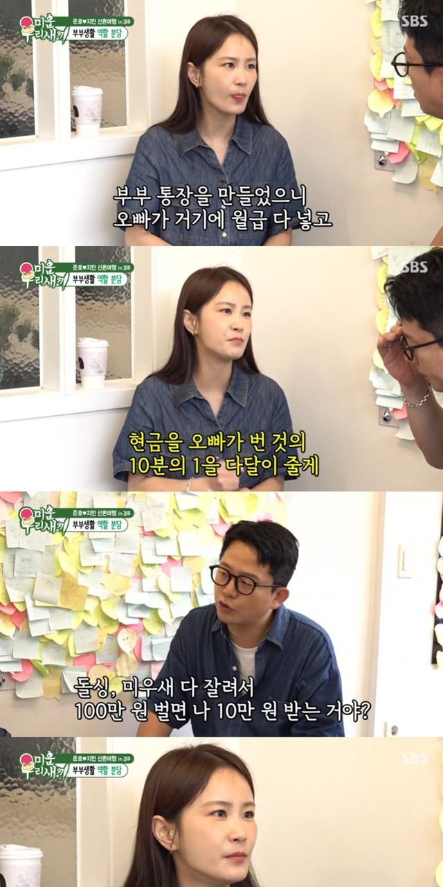 또한 김준호는 "생활비는 오빠가 조금 더 내고"라고 운을 뗐다. 생활비 이야기에 김지민은 "우리가 딱 정한 게, 부부통장을 만들었으니 거기에 오빠가 월급을 다 넣는 거다. 그리고 내가 오빠에게 많이 벌고 싶게 만드는 동기 부여를 위해 제안을 했다"고 설명했다.