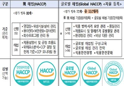 식약처는 글로벌 해썹 등록 기준을 마련하기 위해 국제식품규격위원회(CODEX)의 최신 지침 및 국제식품안전협회(GFSI) 인증 기준 등을 반영하여 기존의 해썹 평가 항목 80개에 국제기준에 부합하는 선행요건 16항목과 관리 기준 56항목을 총 72개 항목을 추가로 마련했다.
