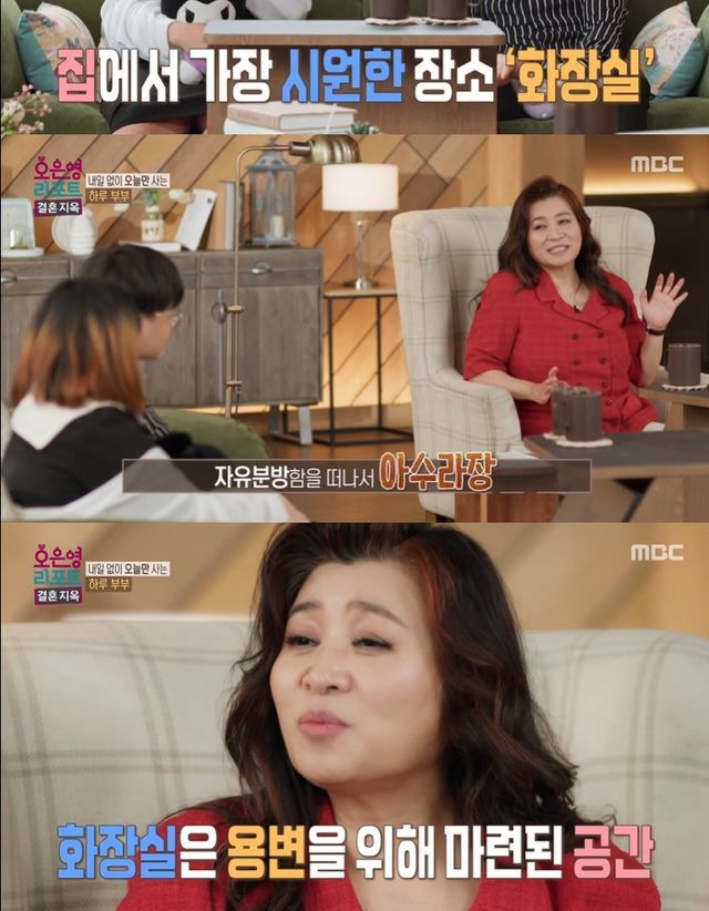 오은영은 "자유분방을 떠나서 정말 아수라장 같은 느낌이다. 지저분한 것도 맞다"며 "김치통이 화장실에 있고, 빨래 바구니가 주방에 있고, 먹을 수 있는 음식과 버려야되는 음식이 옆에 나란히 있고. 물론 화장실이 무지 깨끗한 집도 있다. 그래도 화장실은 볼일을 보는 곳이지 않냐. 구조를 가지고 그 안에서 생활하는 게 중요하다. 그래야 안정감을 느낀다"고 말했다.