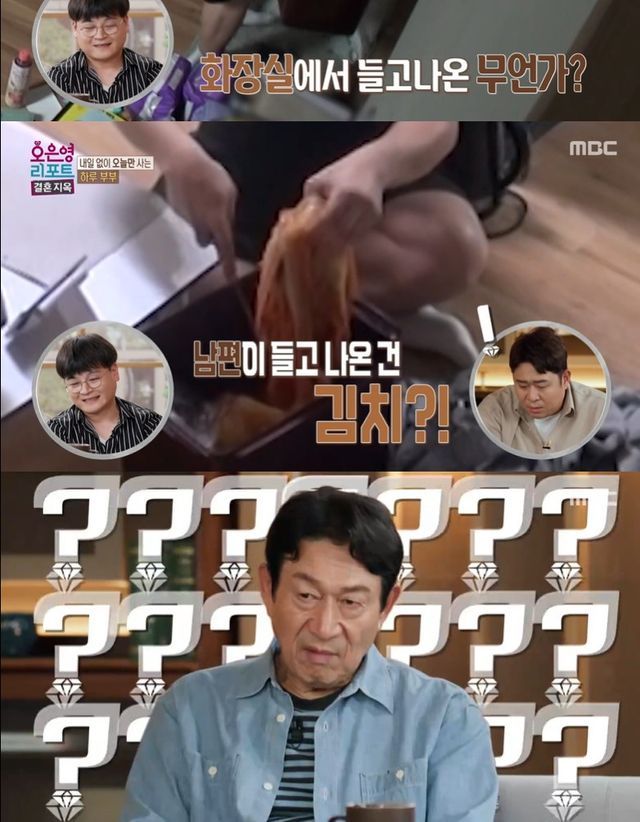 남편이 들고 나온 건 다름 아닌 김치통이었다. 이를 본 문세윤은 "이게 뭐냐. 화장실에서?"라며 당황해했고, 남편은 통에서 김치를 꺼낸 후 다시 화장실로 넣었다.