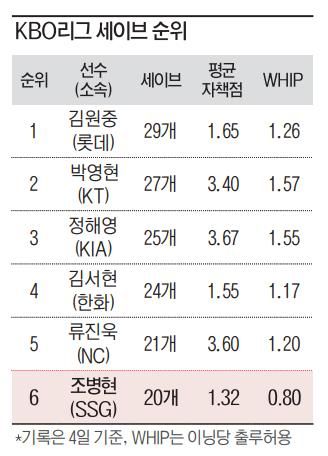 조병현의 성적은 4일 기준으로 47경기 5승 2패 20세이브 평균자책점 1.32이다. 리그에서 두 자릿수 세이브를 기록 중인 마무리 투수는 총 10명. 이 중 1점대 평균자책점은 김원준(롯데 자이언츠·29세이브, 1.65)과 김서현(한화 이글스·24세이브, 1.55) 그리고 조병현 셋뿐이다. 조병현은 최소 40이닝 이상 소화한 리그 불펜 29명 중 유일하게 0점대 이닝당 출루허용(WHIP·0.80)까지 유지하고 있다. 반면 블론 세이브는 주전 마무리 투수 중 가장 적은 1개에 불과하다.