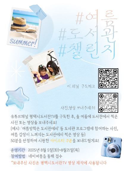유튜브 채널 평택시도서관TV를 구독한 후, 올 여름에 도서관에서 찍은 사진이나 영상을 보내면 된다. 예를 들어, ‘여름방학은 도서관에서’등 도서관 프로그램에 참여하는 사진이나, 여름 감성이 느껴지는 도서관에서 찍은 영상 등을 편집해 보내면 된다.